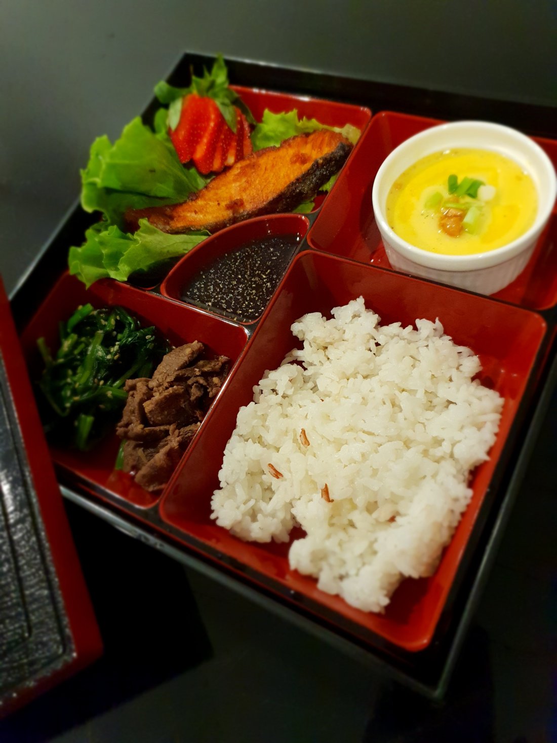 A bento is a single portion take-out or home-packed meal, very common in Japan. There are many varieties of bento box. Some prepared by using seasonal food and expensive ingredients, presented in laquer boxes. Some are just simple lunch boxes, packed in disposable containers, readily available at convenience stores or railway stations.