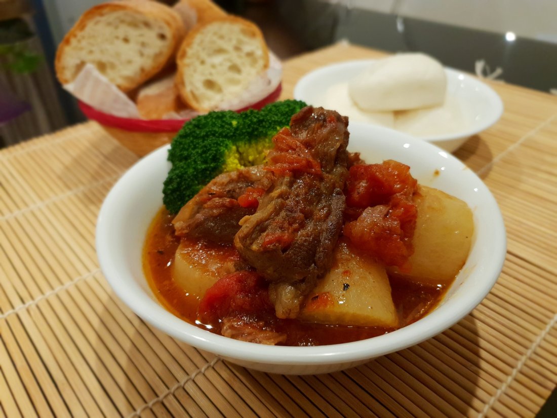 I served this stew with toasted baguette and steamed fluffy mantou. The beef in this stew are soft and almost melt in the mouth, because of hours of stewing on the stovetop. The gravy is full of flavor and best for dunking baguette and mantou. So which pairing is better? I like both.