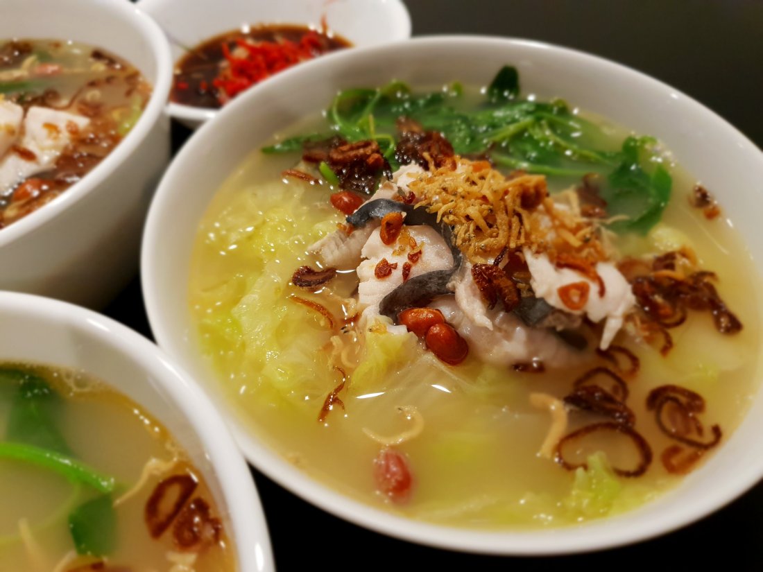 When ready to eat, just add fresh sliced Batang Fish (Spanish Mackerel) to the soup along with selected vegetables. And top with fried shallots, fried anchovies and peanuts. Complete with a plate of sliced red chilli, vinegar and soy sauce for dipping.