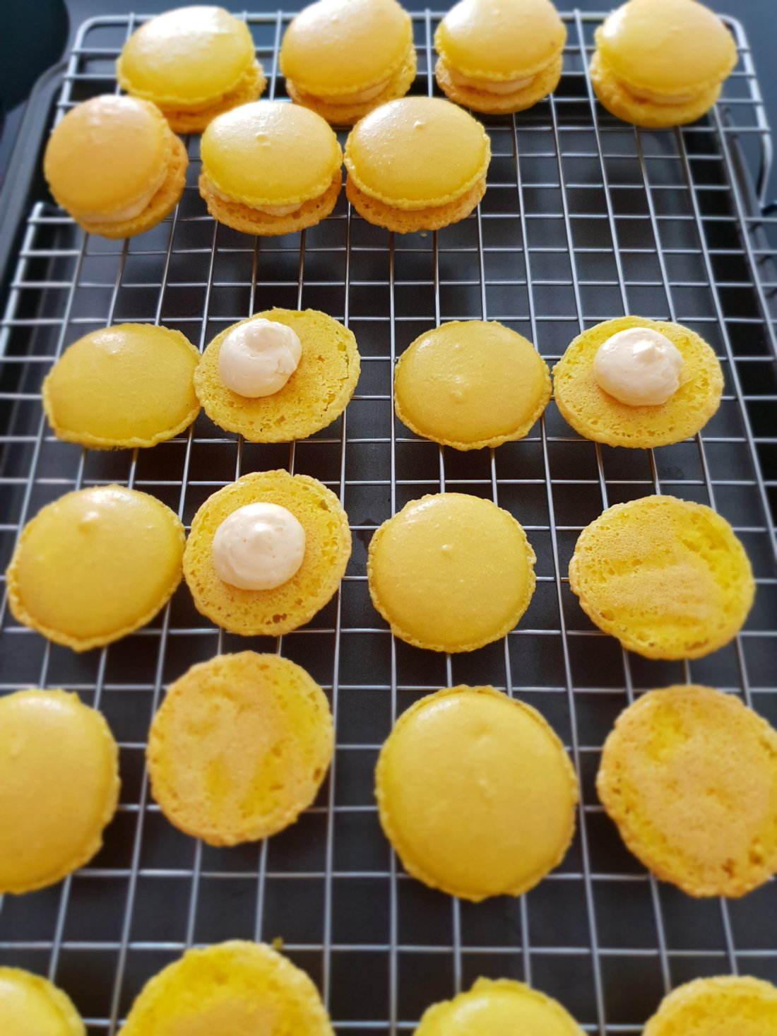 Filling macarons with lemon buttercreamVibrant lemon yellow colour