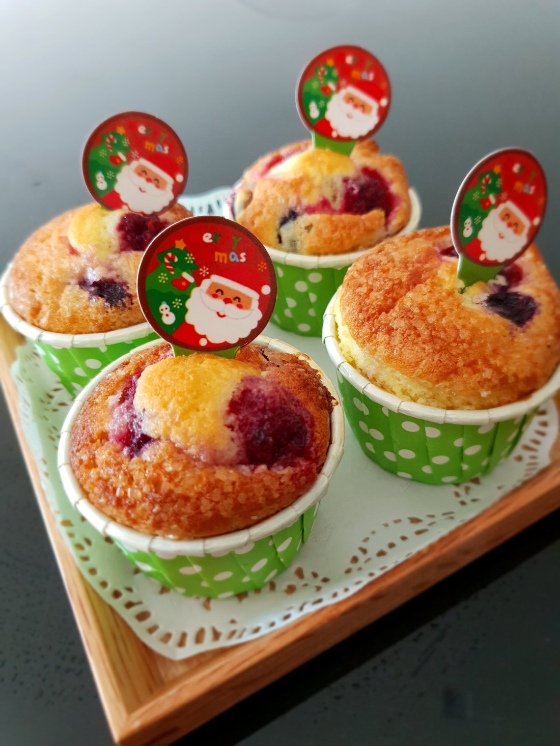 Here, I used red mini muffin cups and adorn them with Christmas cake toppers. These cakes are also filled with fruit jam. The texture of the cake is soft and the addition of fruit jam add an element of surprise.
