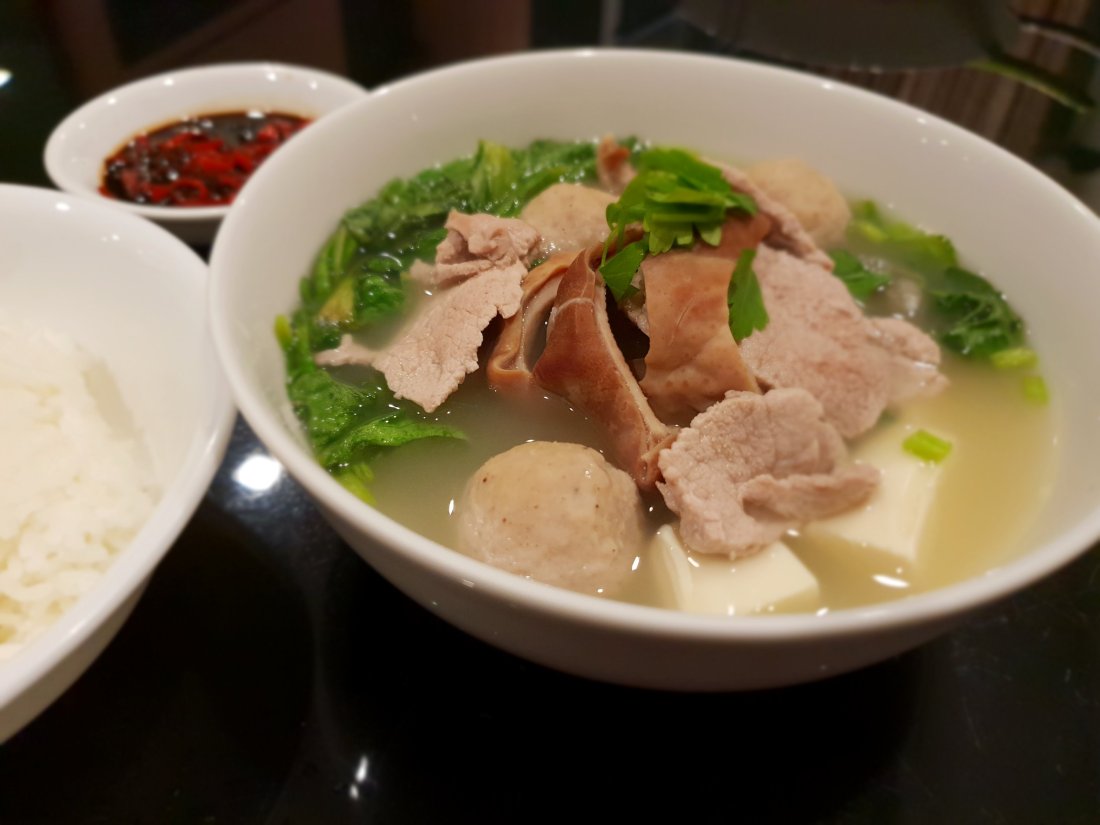 The clear soup, which comes with fishballs, slices of lean pork and pea shoots gets a boost of flavour from the garlic oil and fried garlic. The fishballs are big and bouncy and have a nice bite.
